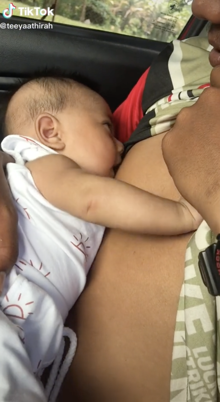 Namun, selepas itu dia sengaja membuka bajunya dan memberikan 'susu' badannya hanya cuma mahu melihat reaksi si anak.