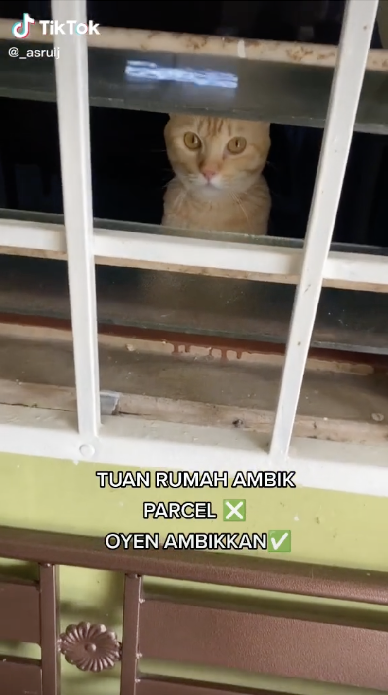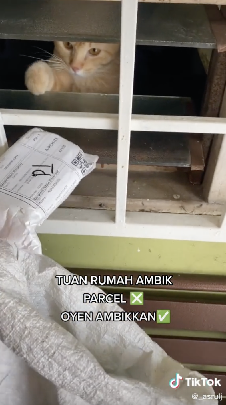 Namun, apa yang menarik perhatian ramai adalah apabila terdapat seekor kucing di sebalik tingkap rumah tersebut. Disebabkan tiada siapa yang boleh menerima parcel, maka si Oyen tolong ambilkan parcel itu.