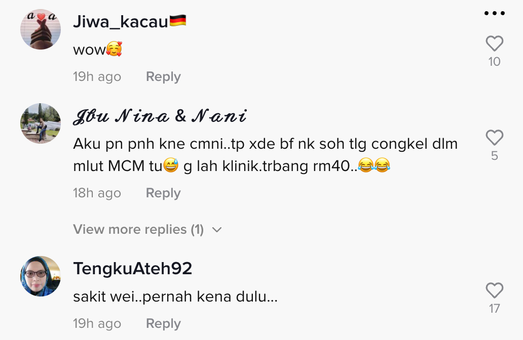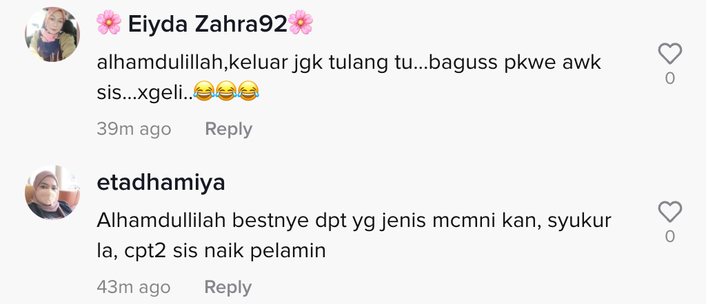 Sementara itu, tinjauan di ruangan komen mendapati rata-rata netizen turut berkongsi pengalaman sama mereka ketika tersangkut tulang ikan. Malah, ada juga yang memberikan pelbagai reaksi selepas melihat video itu.