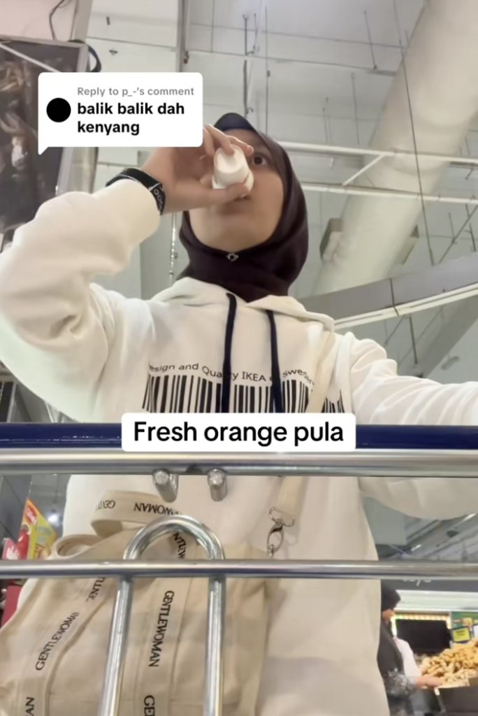 Menerusi perkongsian oleh @itsnanyrahman, wanita berkenaan dilihat mencuba pelbagai jenis makanan dan minuman tester ketika berkunjung ke pasar raya Mydin.