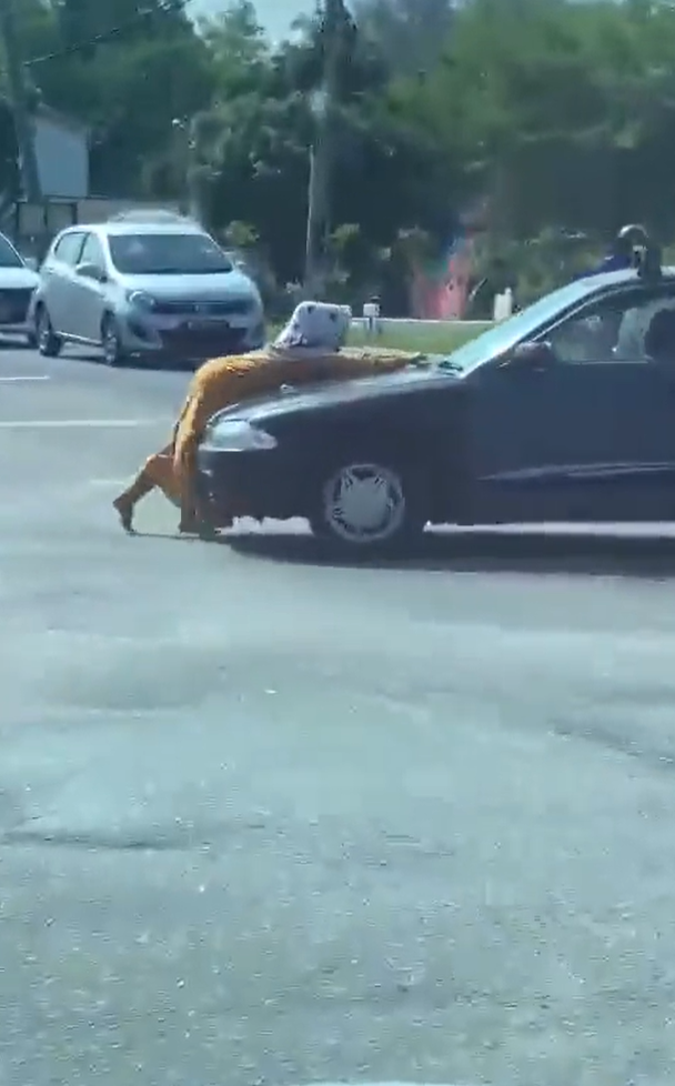 Dalam video itu memaparkan, wanita berbaju oren tersebut cuba menghalang Proton Wira hitam berkenaan daripada membelok di persimpangan lampu isyarat namun tidak berjaya.