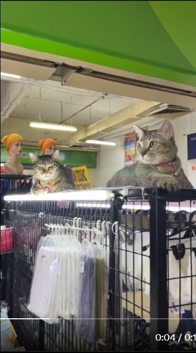 Menerusi video yang telah dimuat naik di Twitter itu, kelihatan sepasang kucing sedang berehat di atas rak barangan.