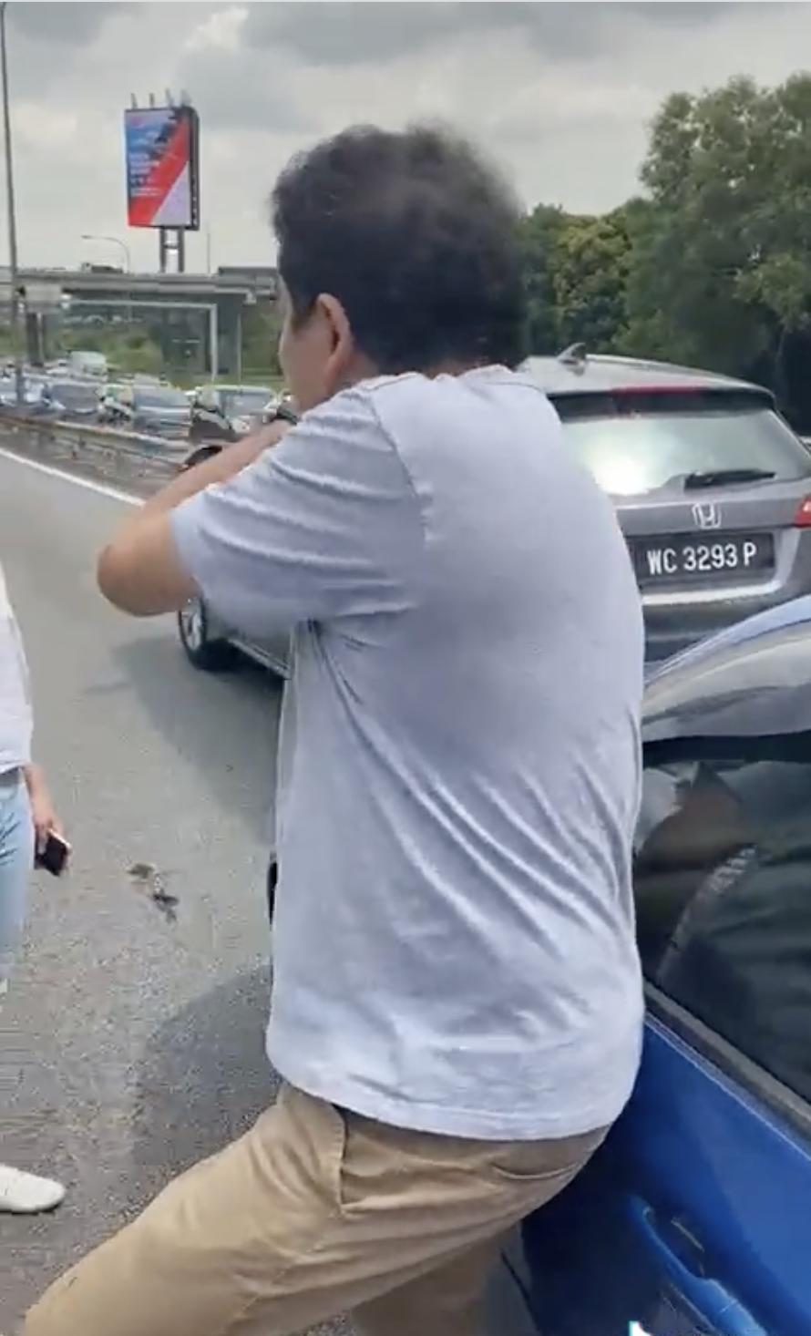 Kelihatan berlaku satu insiden kemalangan di salah sebuah lebuh raya antara seorang lelaki dan seorang wanita.