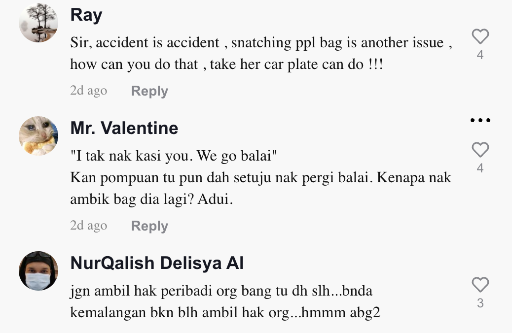 Namun, apa yang lebih mencuri tumpuan adalah lelaki berkenaan bertindak di luar jangkaan dengan merampas beg pemandu wanita tersebut kerana takut dia mencabut lari selepas insiden itu.