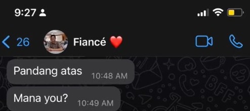 Menerusi video yang dimuat naik oleh @zaitonkhalid08 di TikTok, kelihatan sebuah rakaman screenshot WhatsApp yang menunjukkan perbualannya bersama tunangnya yang menyuruhnya untuk memandang ke atas dan turut menanyakan keberadaannya.