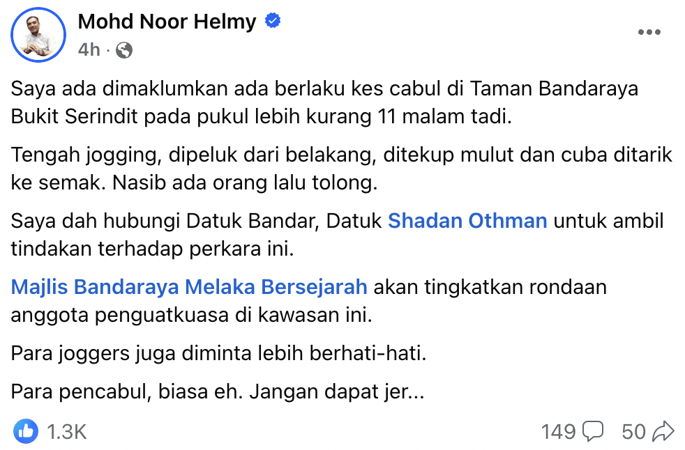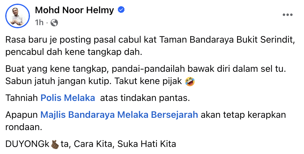 "Rasa baru je posting pasal cabul kat Taman Bandaraya Bukit Serindit, pencabul dah kene tangkap dah.