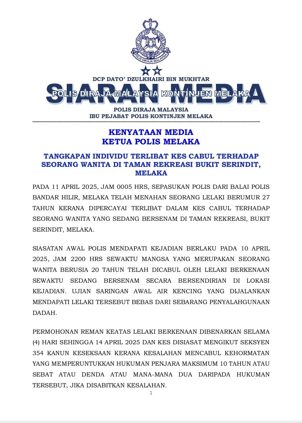 "Permohonan reman ke atas lelaki berkenaan dibenarkan selama 4 hari sehingga 14 April 2025 dan kes disiasat mengikut Seksyen 354 Kanun Keseksaan kerana kesalahan mencabul kehormatan yang memperuntukkan hukuman penjara maksimum 10 tahun atau sebat atau denda atau mana-mana dua daripada hukuman tersebut, jika disabitkan kesalahan," menurut siran media itu.