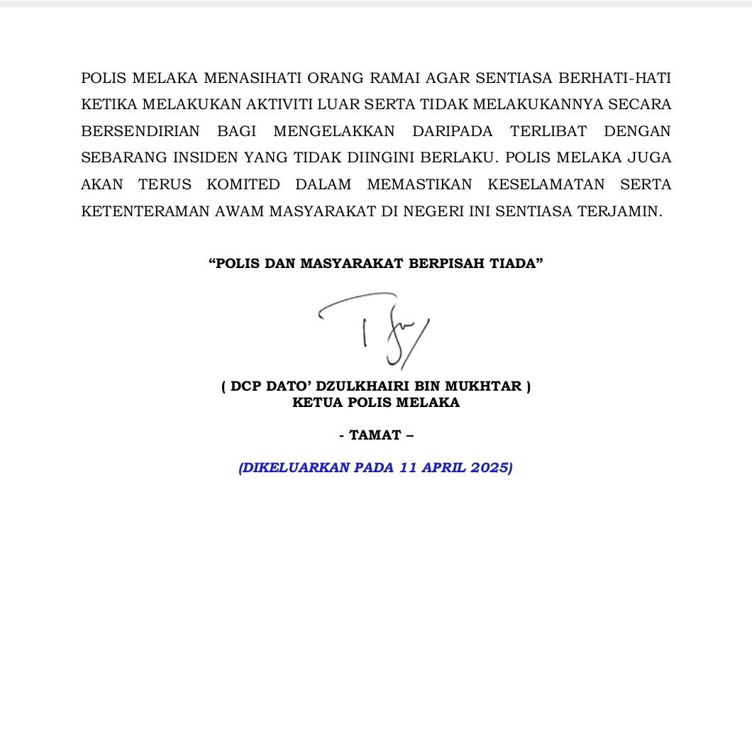 Polis Melaka juga menasihatkan agar orang ramai sentiasa berhati-hati dalam melakukan aktiviti terutama jika bersendirian bagi mengelakkan terjadi insiden yang tidak diingini.