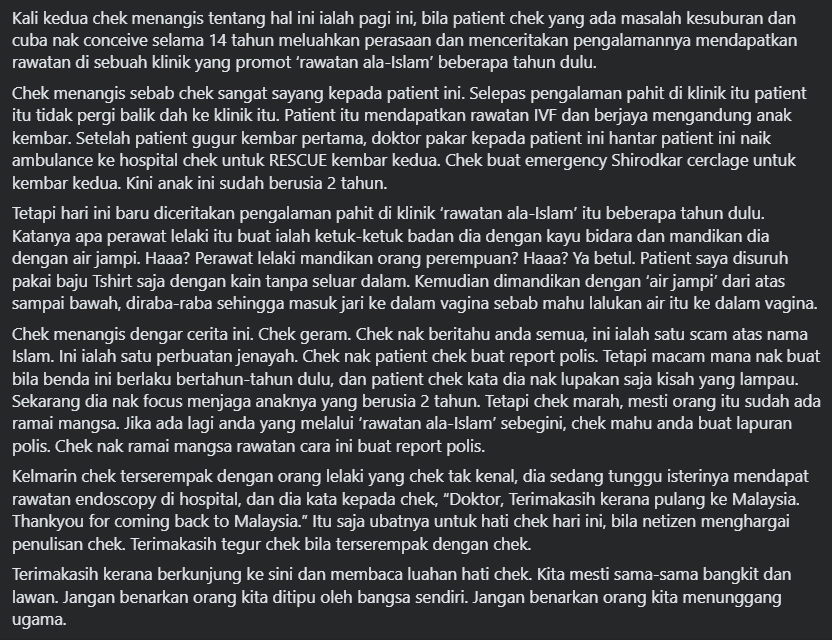 Menerusi perkongsian Dr Imelda Balchin di Facebook, dia berkongsi kisah di mana dia mendapat tahu pesakitnya yang telah gugur kembar pertama, diambil kesempatan oleh penunggang 'rawatan ala-Islam' sebelum ini.
