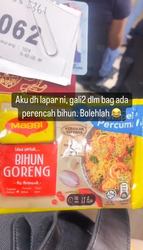 Apa yang menarik perhatian adalah dia dilihat terjumpa paket perencah bihun ketika dia mencari sesuatu di dalam begnya kerana lapar.