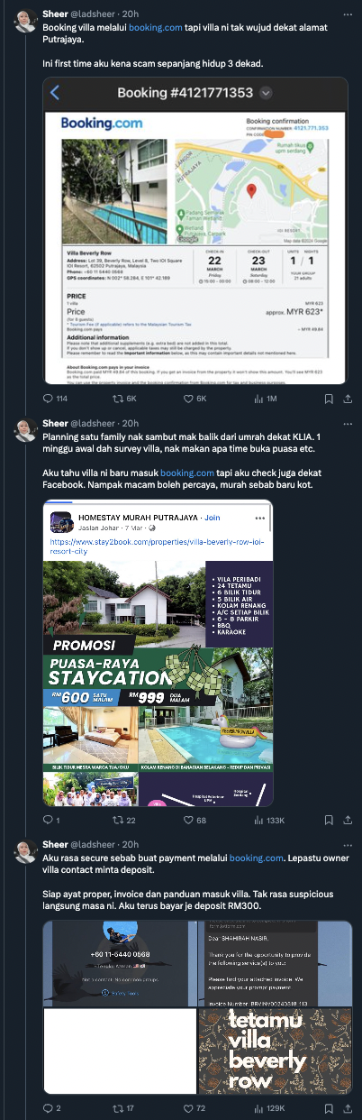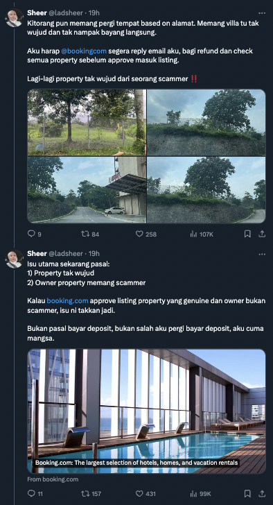 Menerusi posting tersebut, seorang wanita di aplikasi X berkongsi dia pada awalnya telah menempah sebuah villa di aplikasi tempahan hotel terkenal.