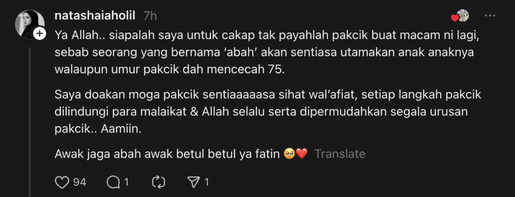 "Umur dah mencecah 75 tahun tapi masih kuat dan gagah. Terima kasih abah sentiasa ada dan setia menjaga saya yang dah besar panjang ni. Ini lah insan yg bergelar 'ayah'. Insan yang paling saya sayang," katanya lagi.