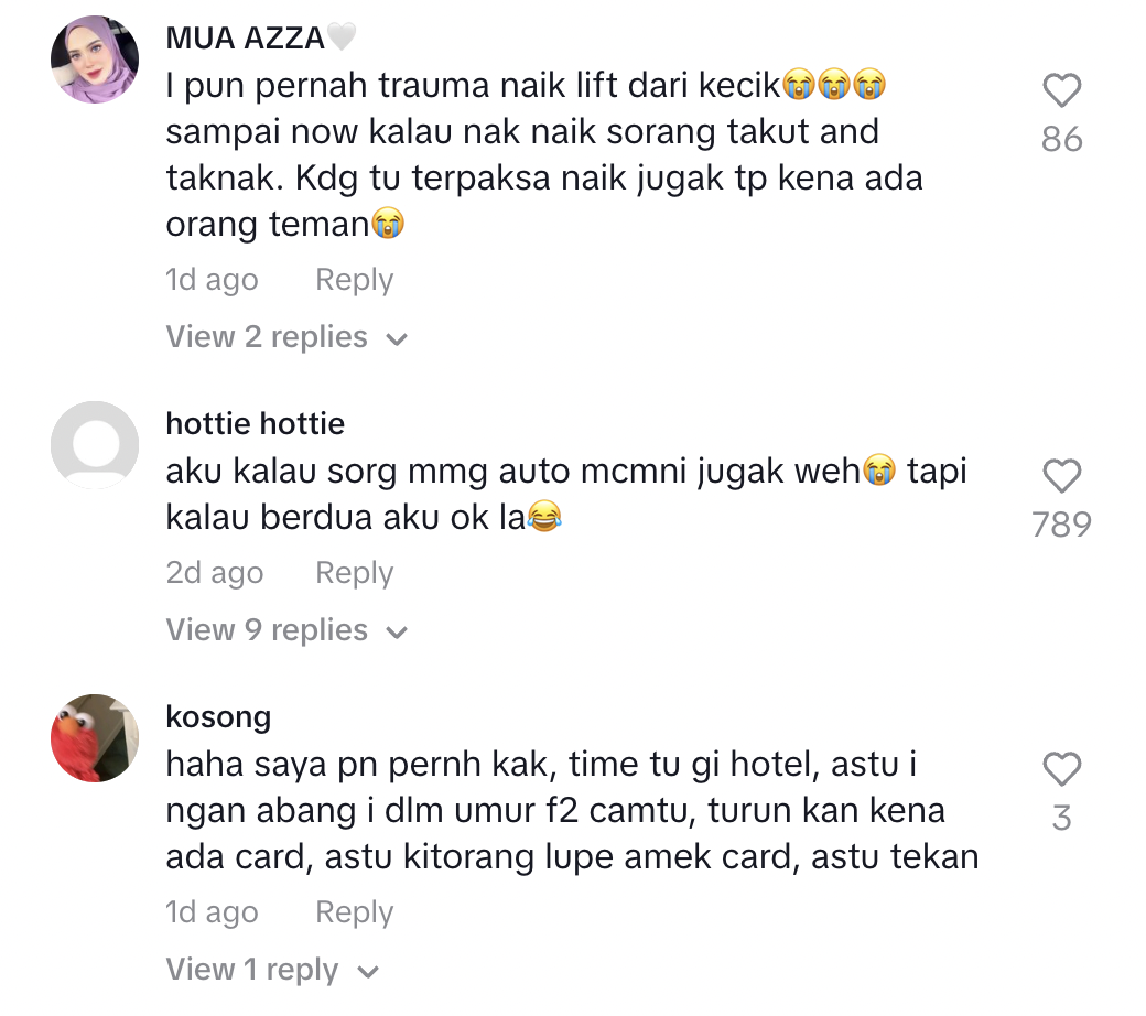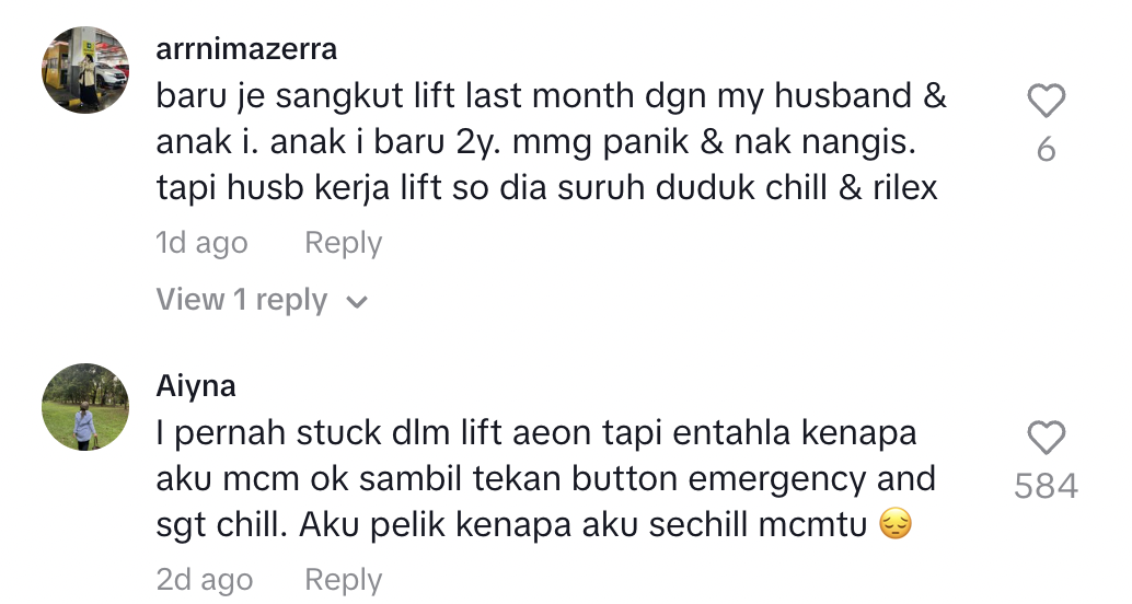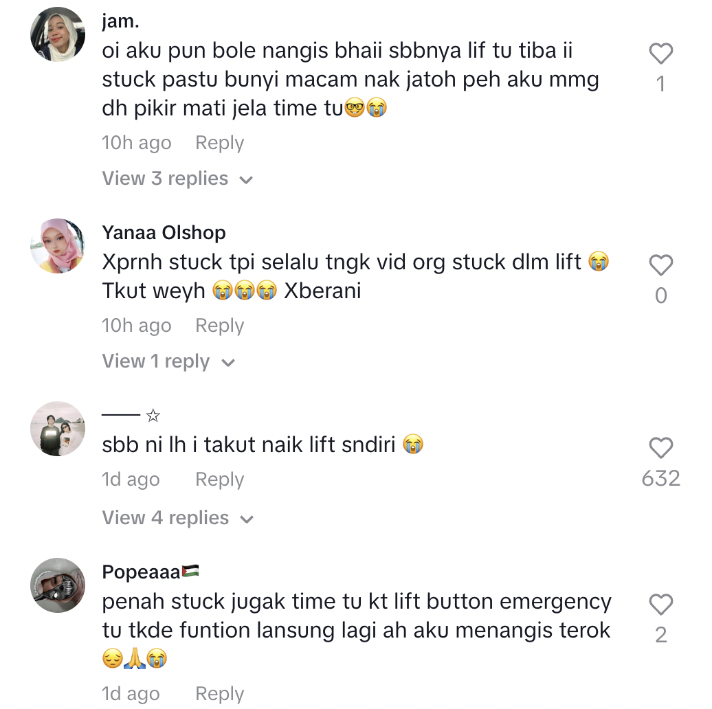 "Tak pernah stuck tapi selalu tengok video orang stuck dalam lift. Takut weh" – Netizen