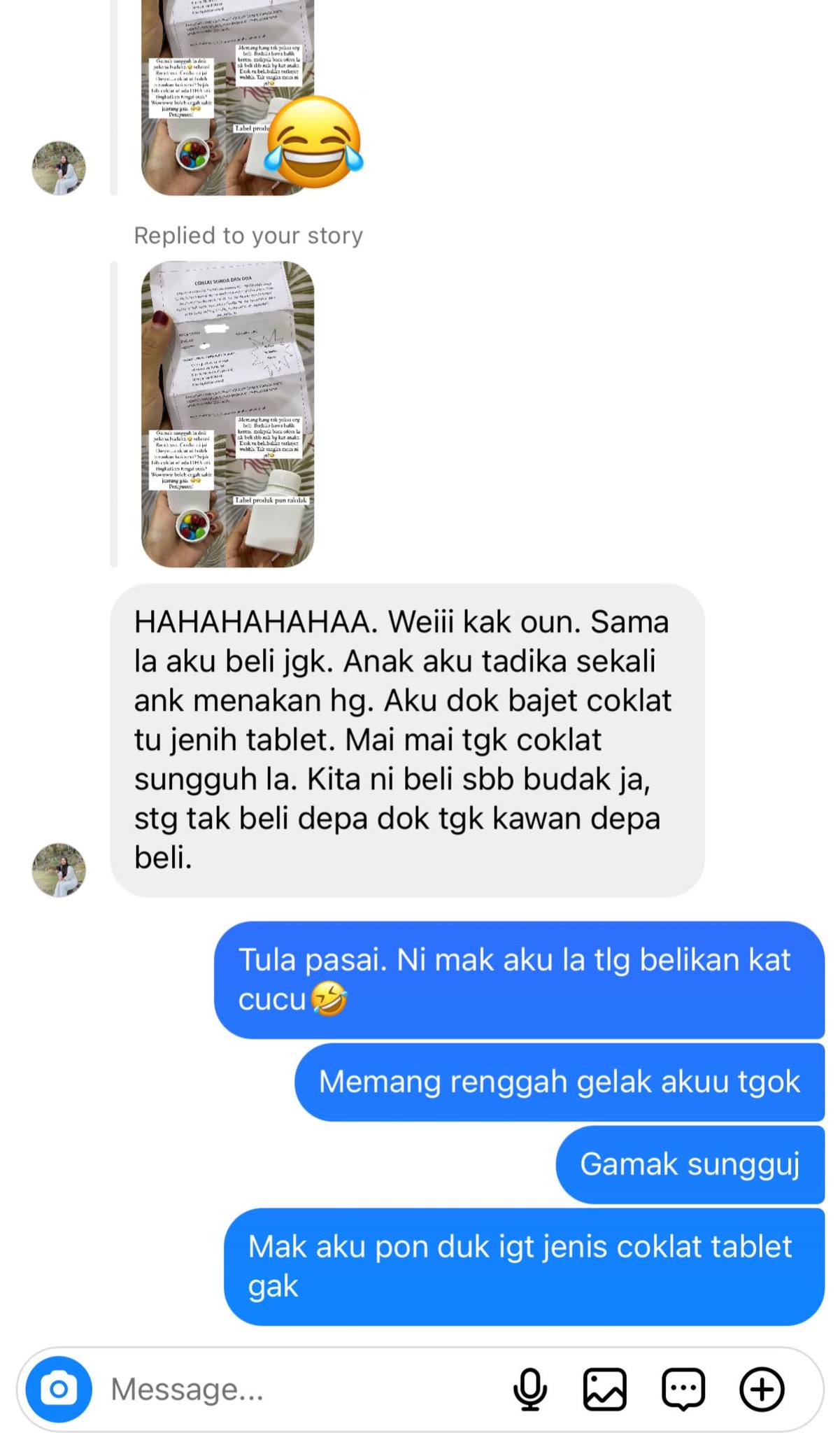"Tergamak sungguh menipu budak-budak. Ingatkan ubat dalam bentuk tablet, rupa-rupanya memang coklat.