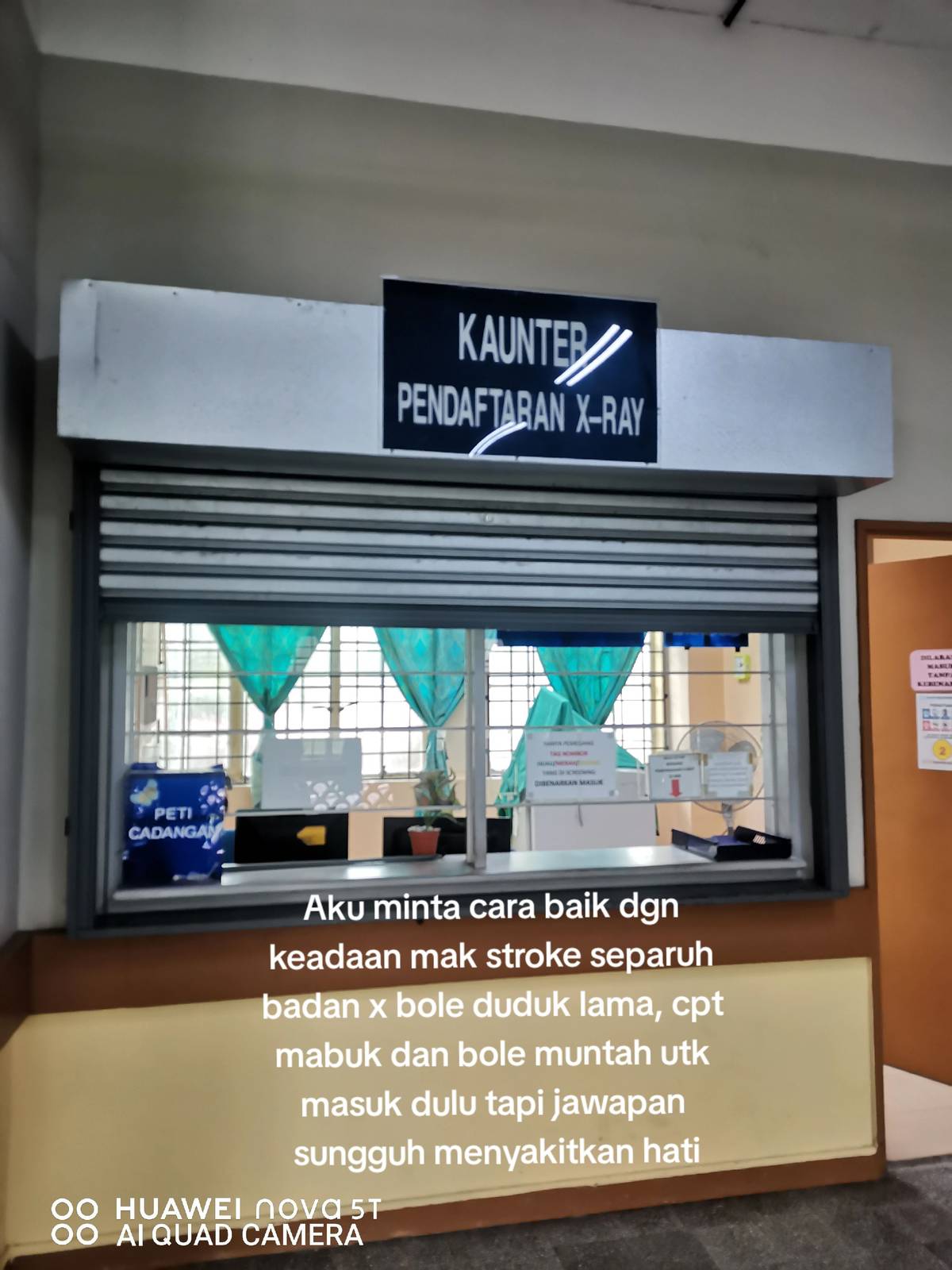 "Sampai di kaunter pendaftaran x-ray aku diberi nombor giliran dan tunggu. Mak mula pening dan aku terus ke perempuan (kakitangan) tadi (menjelaskan) Puan, mak saya stroke, tak boleh duduk lama, itu dia dah terbongkok mula pening dan muntah, dia boleh jawab 'habis tu'," tulisnya.