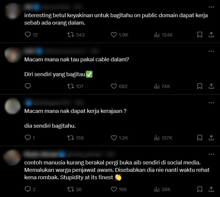 "I sebab ada orang dalam," jawab wanita berkenaan. Perkara ini telah membuatkan apa yang dikongsinya itu tersebar ke platform X di mana dia terima banyak kecaman disebabkan jawapannya itu.
