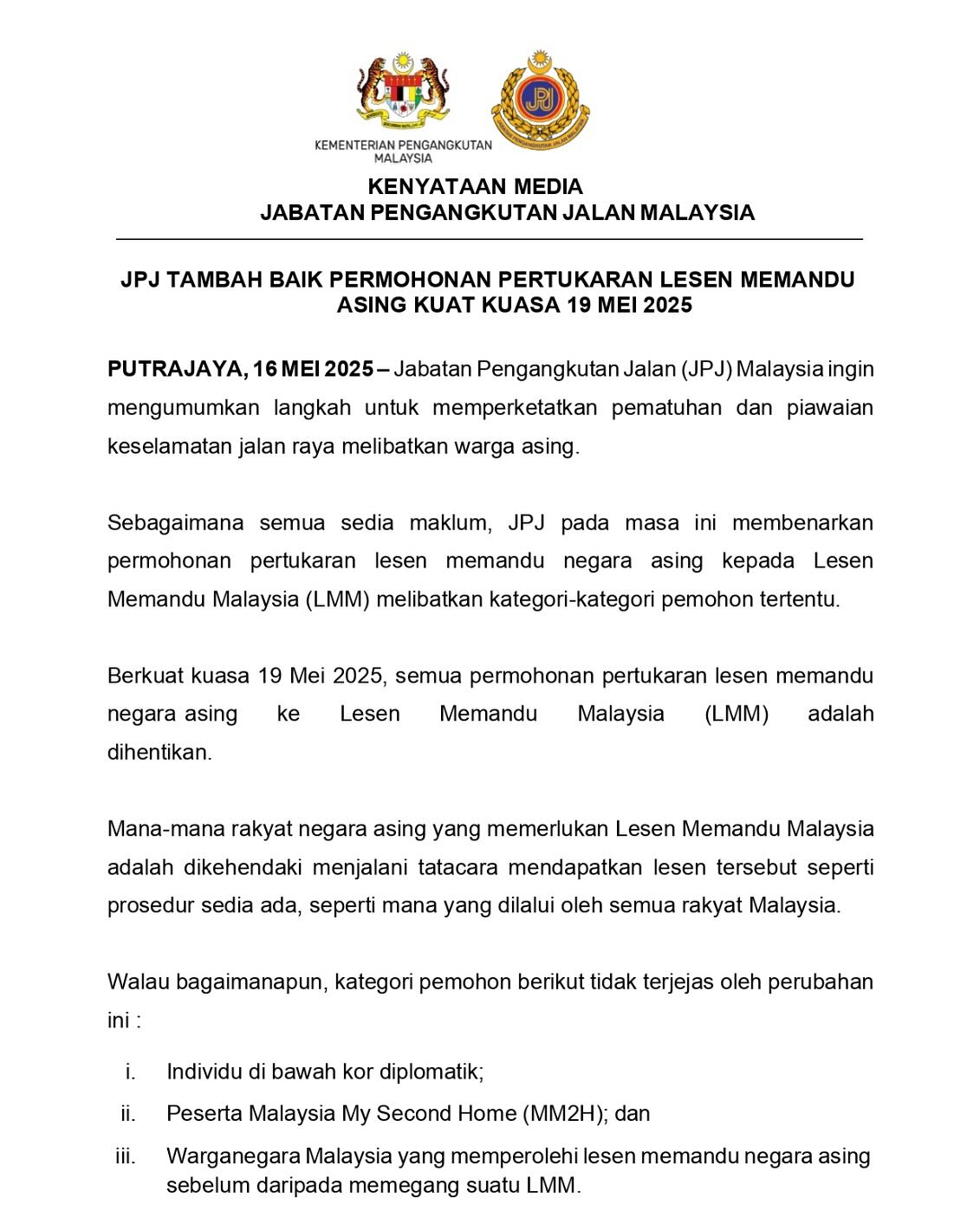 "Mulai 19 Mei ini, semua permohonan pertukaran lesen memandu negara asing kepada LMM akan dihentikan sepenuhnya," kata kenyataan itu.
