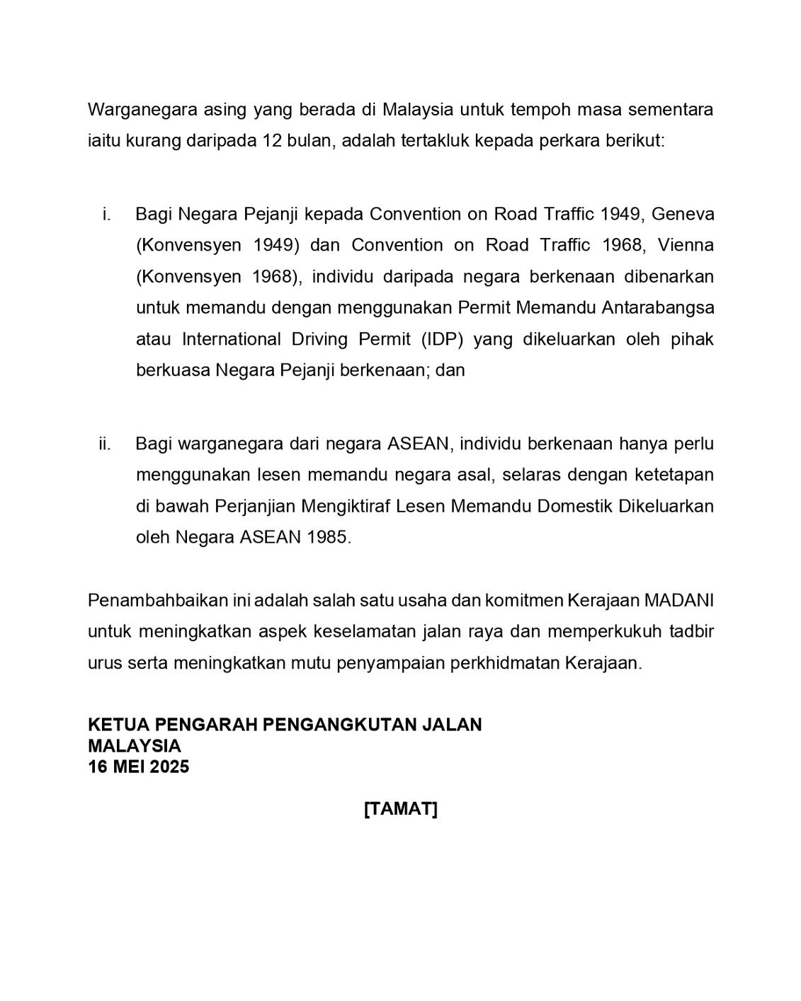 Tambah beliau, warganegara asing yang berada di negara ini untuk tempoh sementara kurang daripada 12 bulan masih dibenarkan memandu tertakluk kepada syarat-syarat sedia ada.