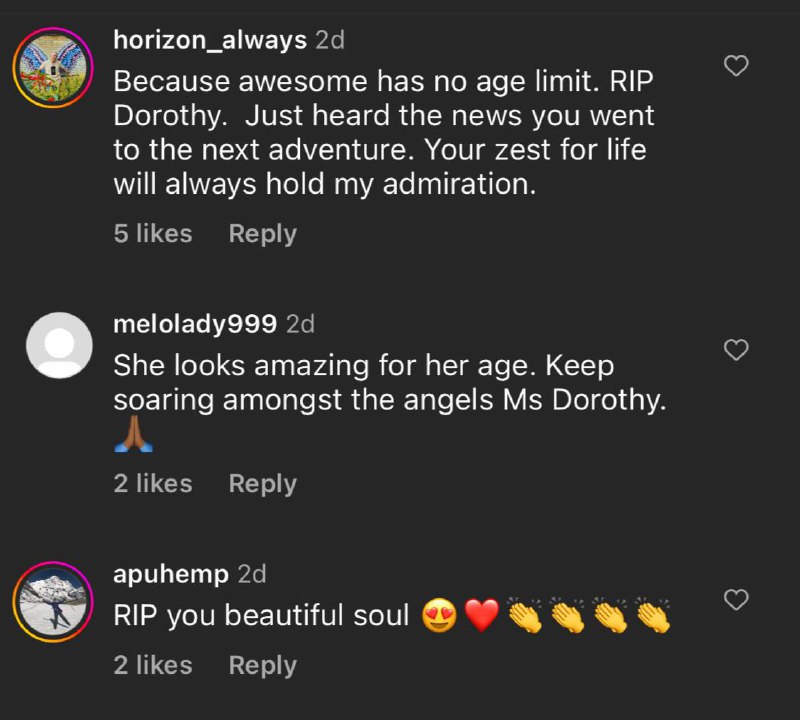 "Jadi, apa kaitan antara umur dengan apa yang anda mahu lakukan? Saya berusia 104 tahun, tidak ada masalah apa-apa pun," komen Dorothy ketika itu.