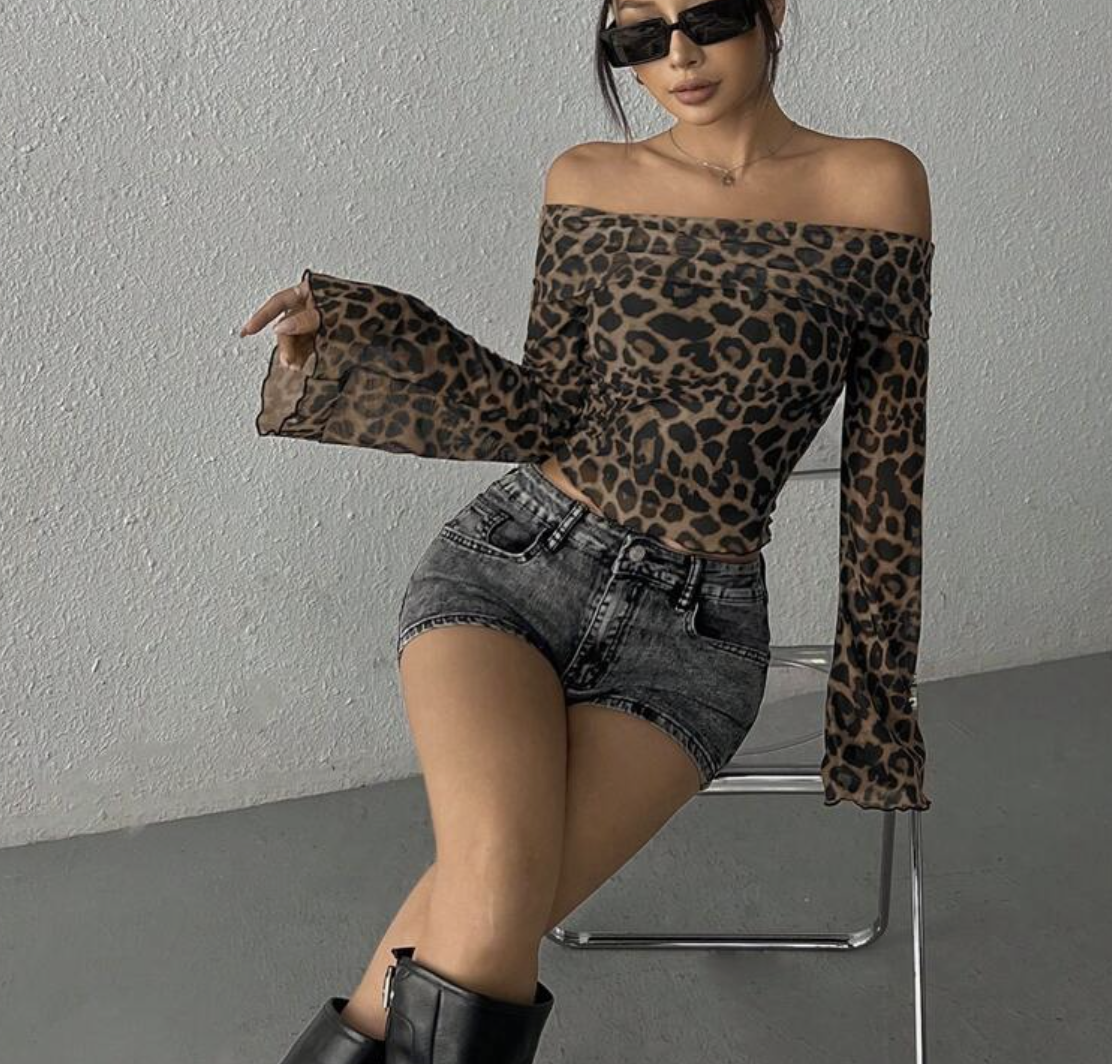 3. MainGRL Off-Shoulder Leopard Print Mesh Puff Sleeve Cropped T-Shirt
