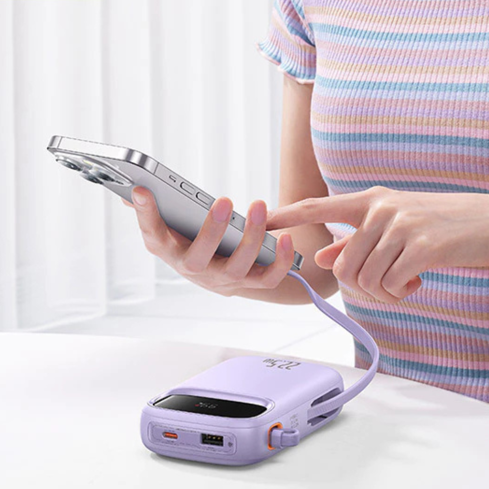 Besides fast charging, this one also comes with a small current mode for smaller electronic devices as well as two built-in cables, one of which can even double as a lanyard.