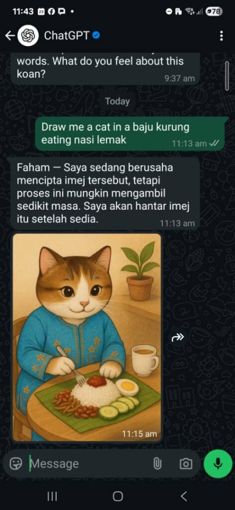 For example: "Draw me a cat in a baju kurung eating nasi lemak."