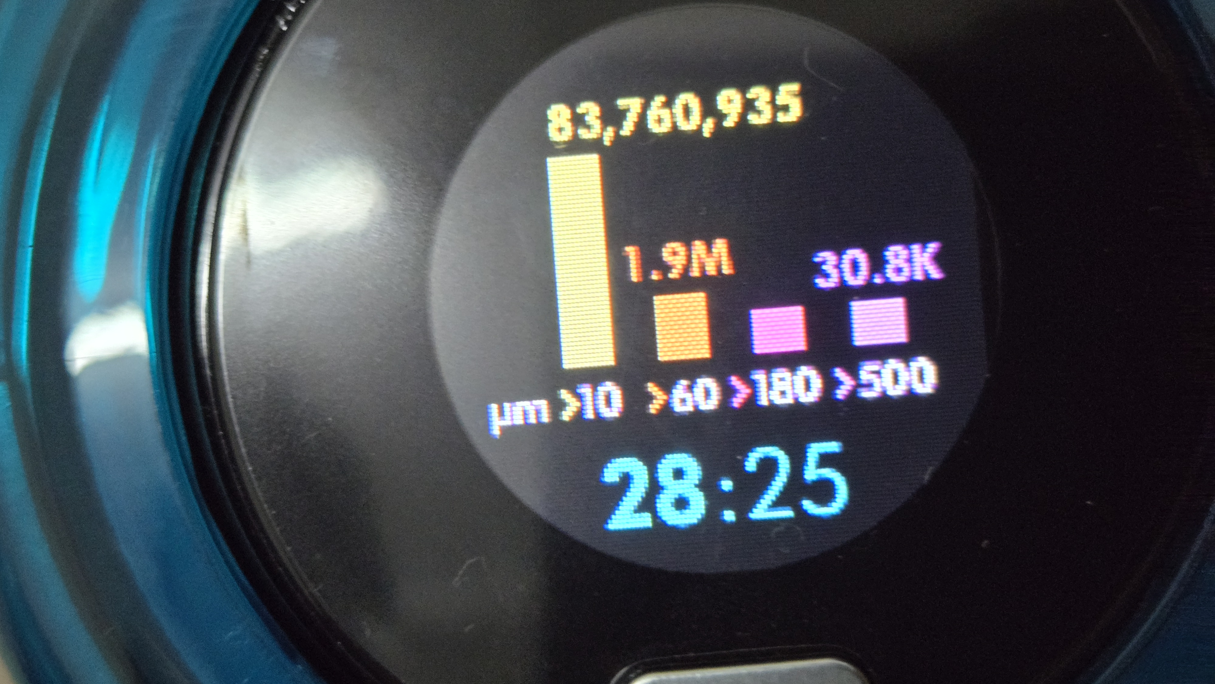 The first thing you'd notice when you turn on the device and vacuum is the LCD screen which displays what has been sucked up. The dust and dirt are categorised into four categories, each coloured differently: hair particles and pollens (yellow), microscopic dust (orange), dust mites (purple), and sugar (pink).