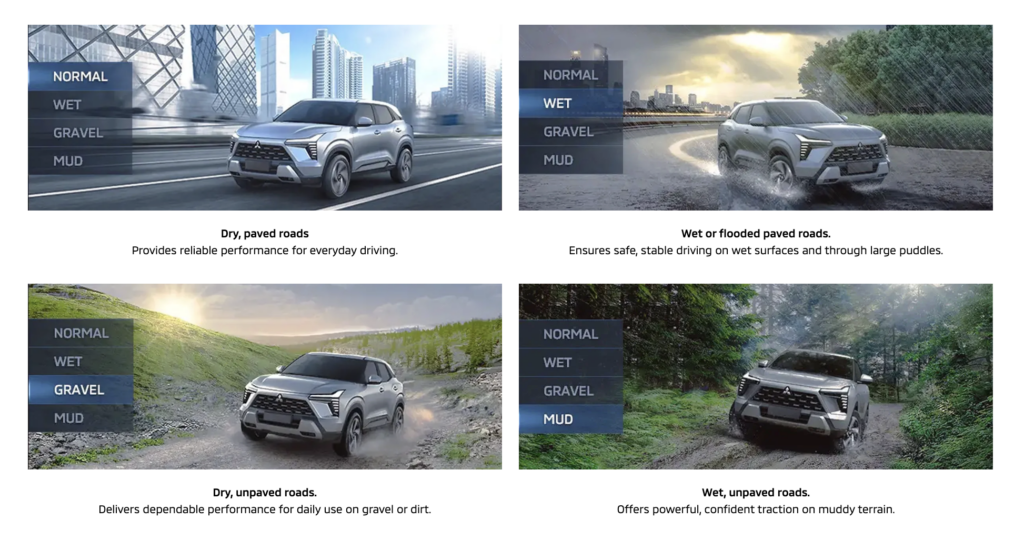 Drivers can select from four drive modes — Normal, Wet, Gravel, and Mud. This first-of-its-kind feature allows you to adapt seamlessly to varying road conditions with just a press of a button.