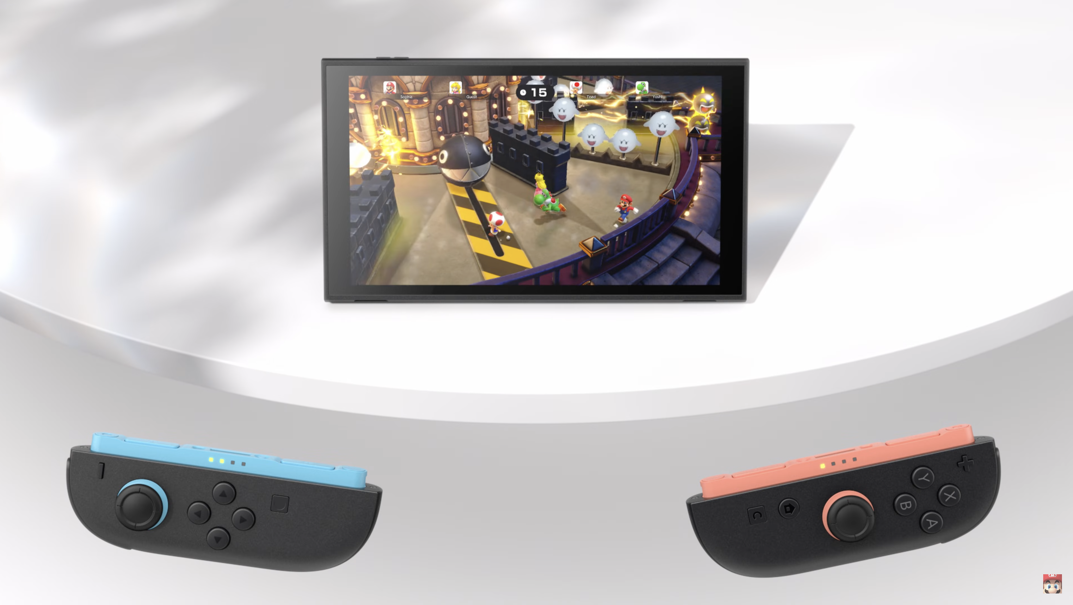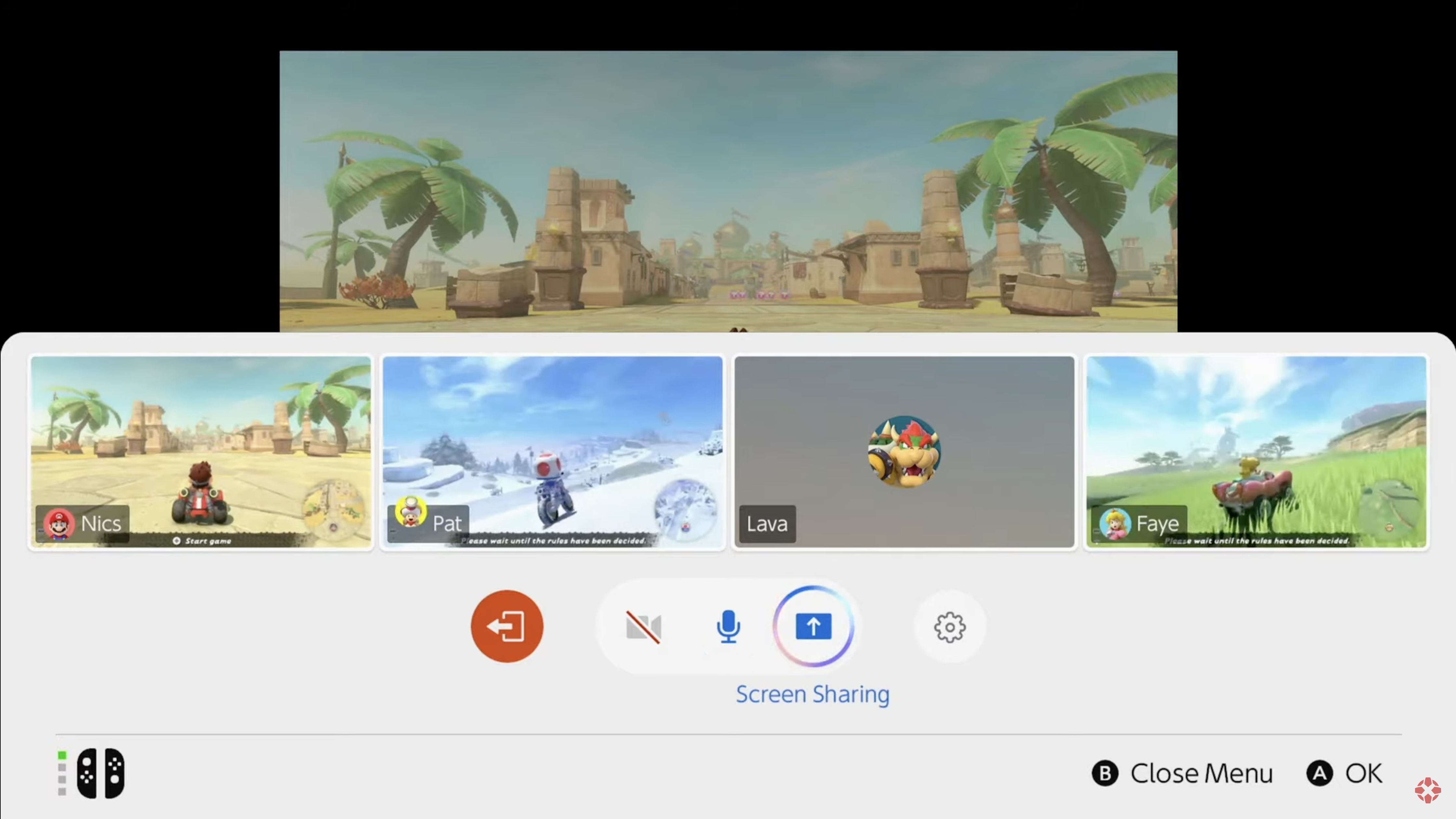 New Joy-Con 2 controllers introduce a "C" button for seamless GameChat access. Simply tapping on it brings up the chat menu which include options to turn off video and microphone, screen share, chat while playing different games, and expand the screen to view another friend's game.