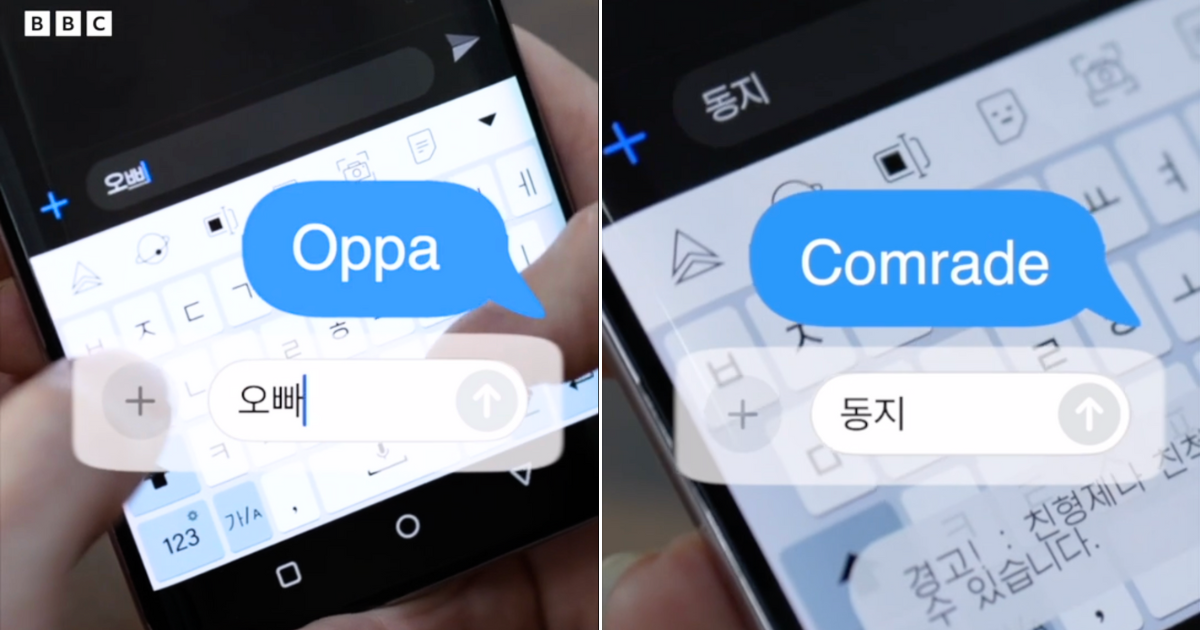 The word "oppa", commonly used to refer to an older brother or boyfriend in South Korea, is auto-corrected to "comrade". A warning appears: "This word can only be used to describe your siblings."