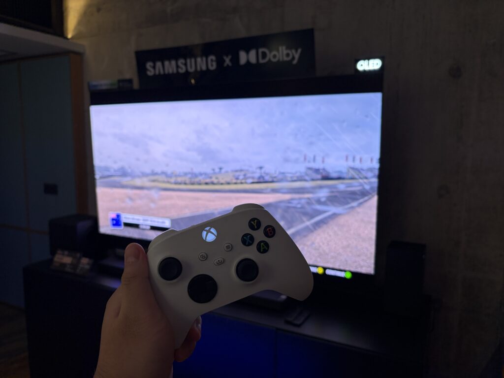 The final experiential room was tailored specifically for gamers. Playing Grid Legends on the massive screen, paired with Dolby-enhanced audio, transported us directly onto the racetrack. Every tyre squeal and engine rev was rendered in high fidelity, providing clear aural cues that helped ensure we stayed on the right line throughout the race.
