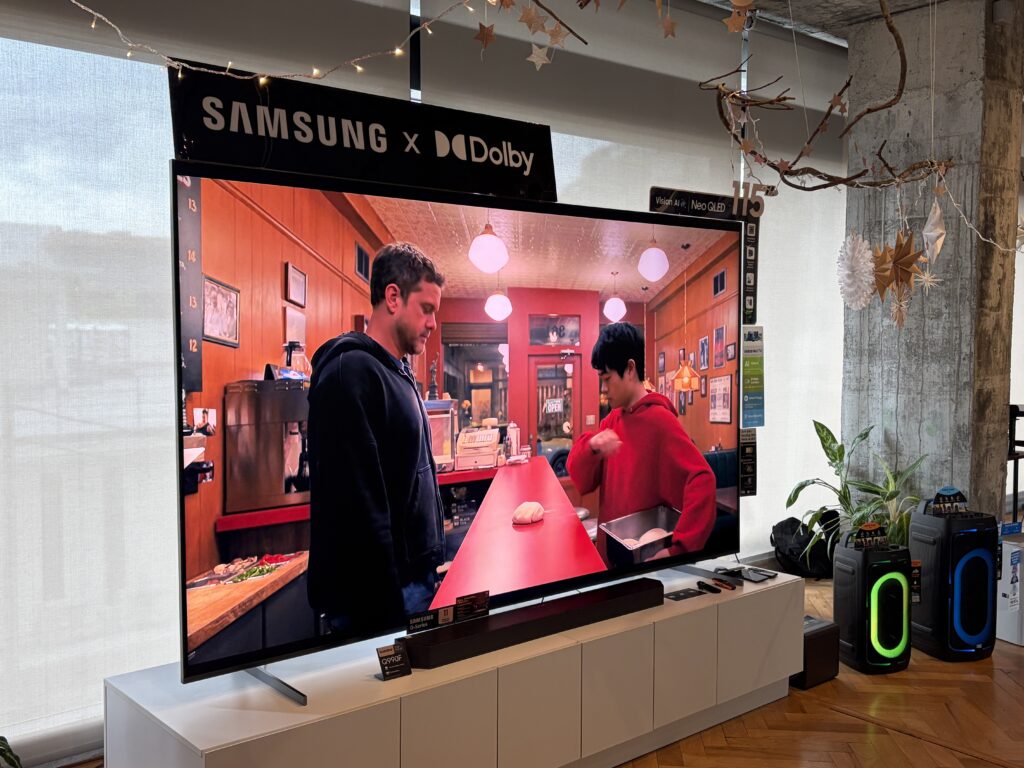 When combined with the Samsung HW-Q990F soundbar, the system produces a cinematic, room-filling audio performance. This pairing effectively highlights the flawless synchrony between the premium visuals and the immersive sound.