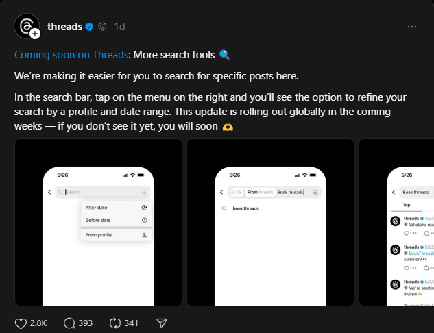 The platform now allows users to refine their searches by profile and date range, a feature announced in a post on Threads' official account.